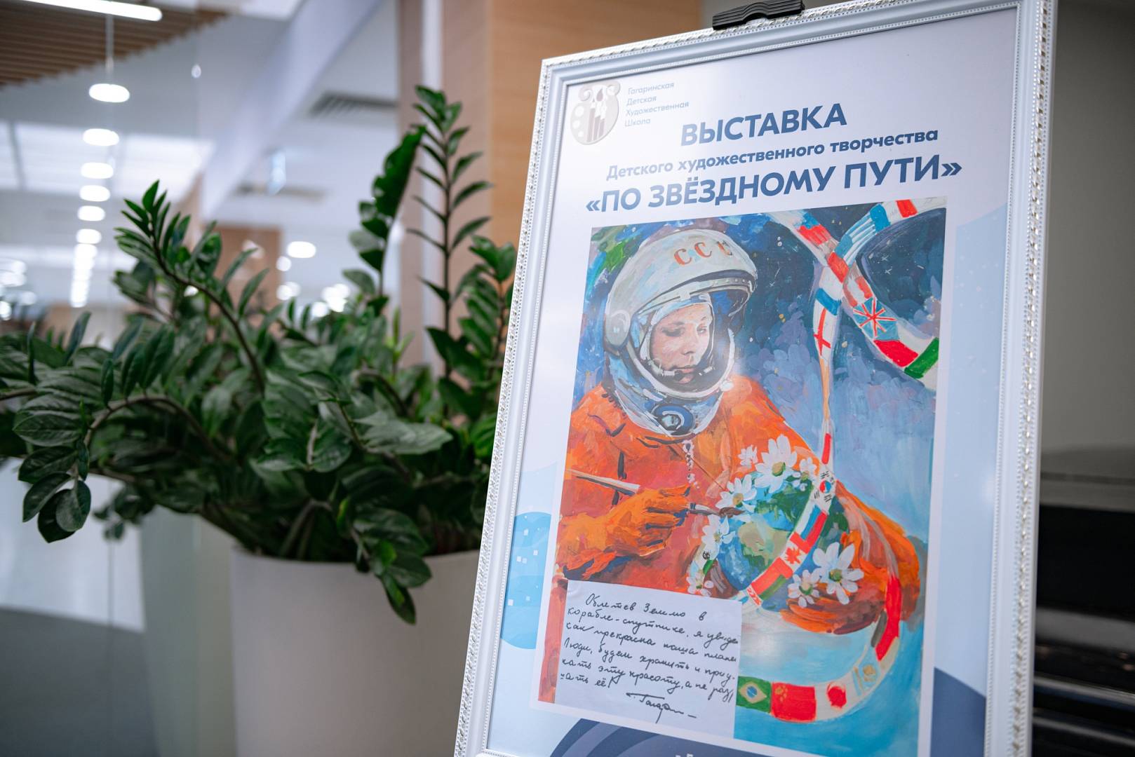 В экспозиции представлены 17 работ победителей и призеров разных лет конкурса детского художественного творчества «По звездному пути», который проводится более 15 лет на родине первого космонавта Земли Юрия Гагарина. Мероприятие направленно на сохранение исторической памяти, формирование у подрастающего поколения интереса к космической отрасли и ее представителям.